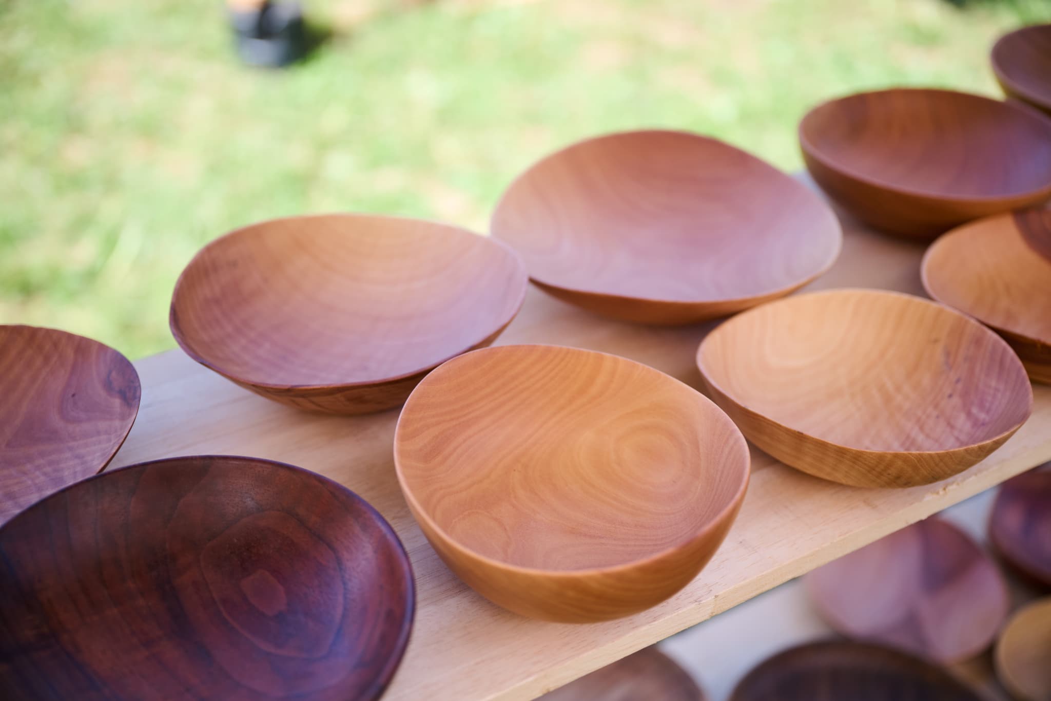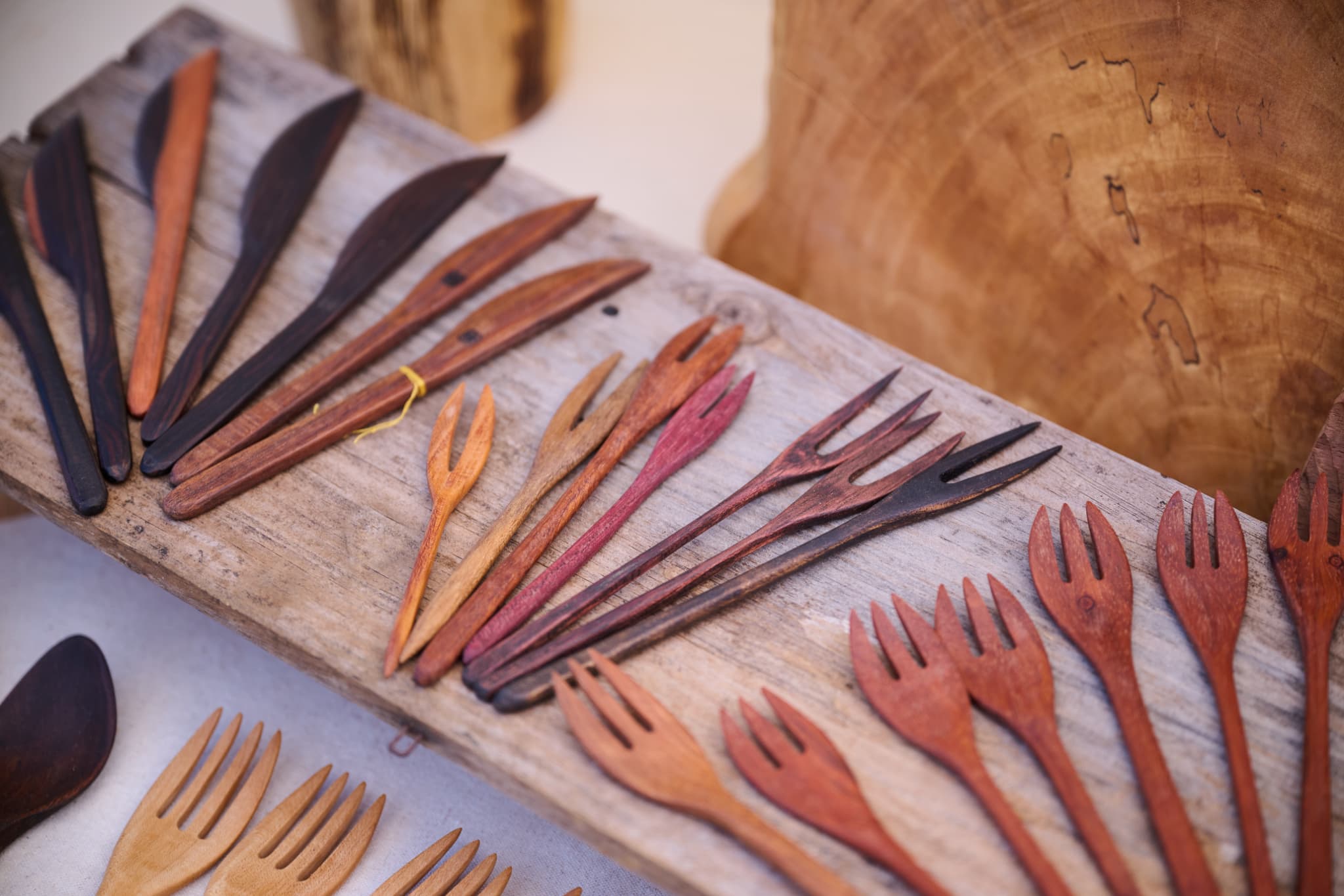 花瓶、サラダボウルや皿、カトラリー、アクセサリーなど多彩な木工製品がブースに並べられているが、山田さんのイチオシはランプシェード。ケヤキ、サクラ、シデなど、そのときに手に入った木材を使ってつくるが、木の種類によって独特の個性や形、風合いが表れるのだとか。「カチッとした工業製品よりも、少し歪んでいたりするほうが手づくり感があっていいとお客様に喜んでいただいています」と山田さんは微笑む。日本の国土の3分の2を占める森林は、CO2を吸収して気候変動を緩和したり、水を濾過したり、土砂崩れなどの災害を防ぐという役割も担っている。暮らしと森のつながりにも気づかされる製品だ。